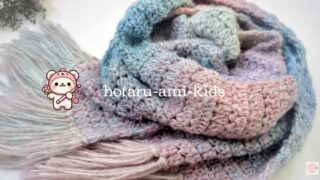 びいどろヤーンの“きらっと透明感のある色合い”が主役で、編み地に出るグラデ感がとにかく可愛いです。そこにテンダーフォグのアイボリー×ラベンダーグレーを挟むことで、やさしい雰囲気が増して全体がふんわりまとまります。