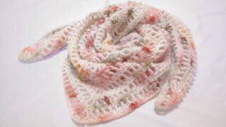 縁は表引き上げ×裏引き上げでキュッと整い、本体は玉編み+方眼で立体的なヒラヒラ感が出るのが可愛い!水色のぽつぽつも映えて、模様の変化を楽しみながら編めます(*’ω’*)
